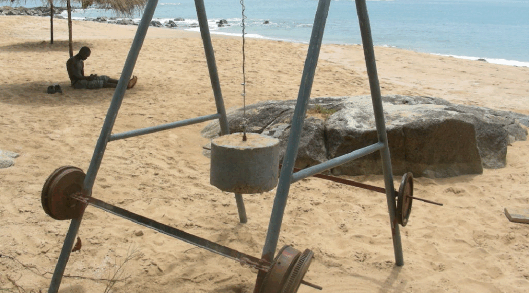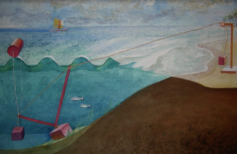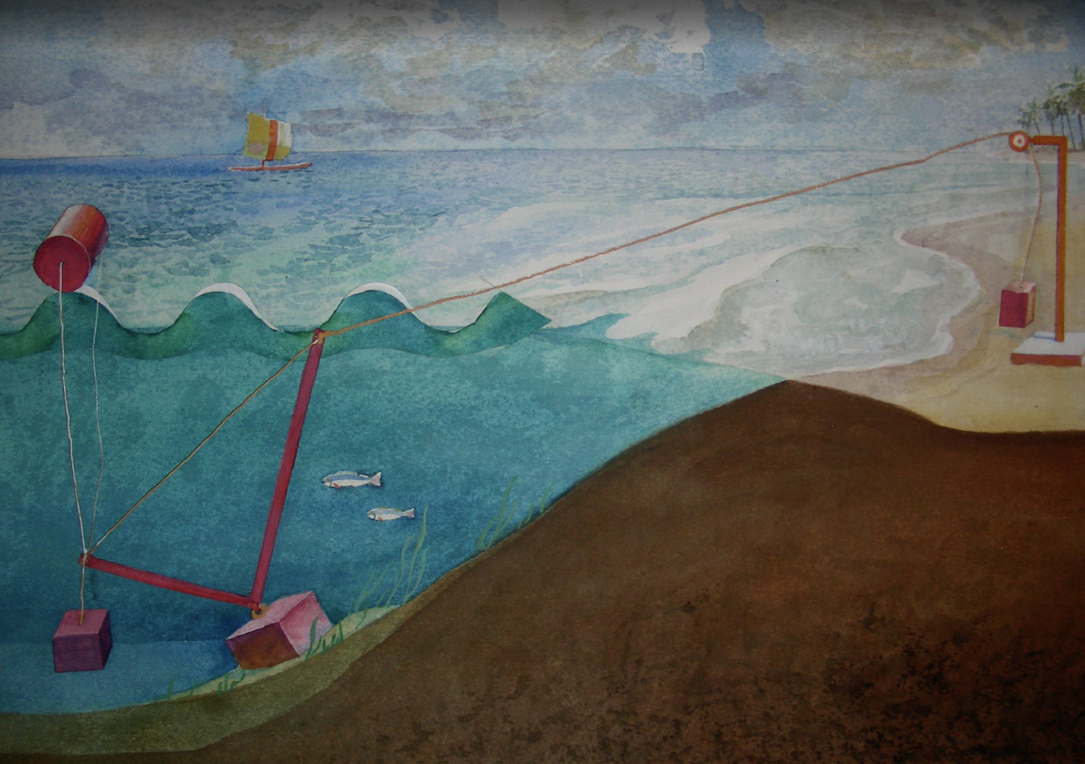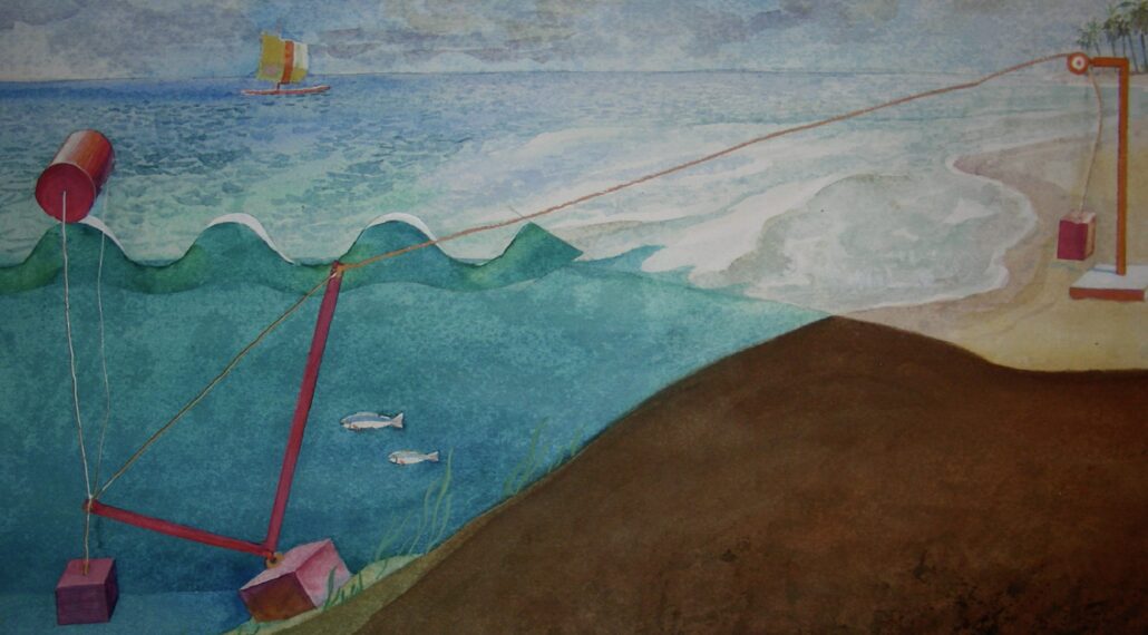 Initial artist’s conception of device eventually deployed in Guinea. The weight below the barrel is heavier than the weight on shore, so that force can be captured onshore regardless of whether the barrel is falling or rising on the waves..