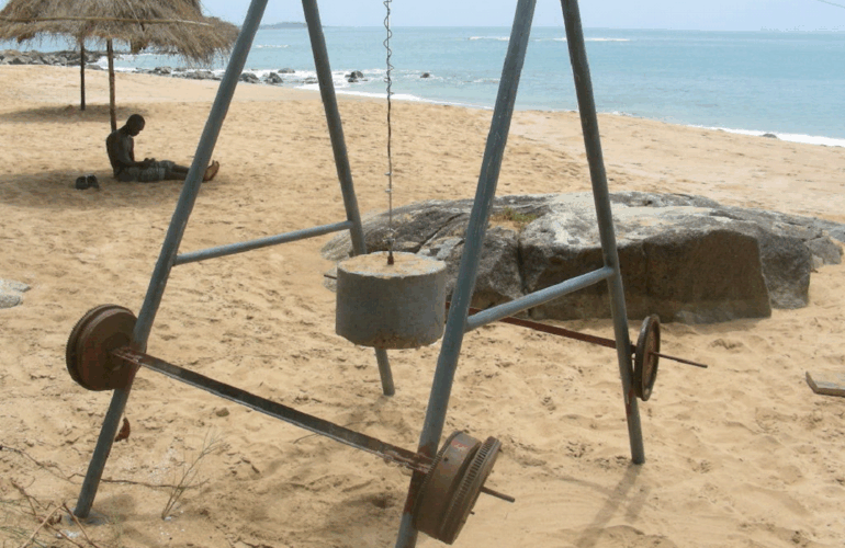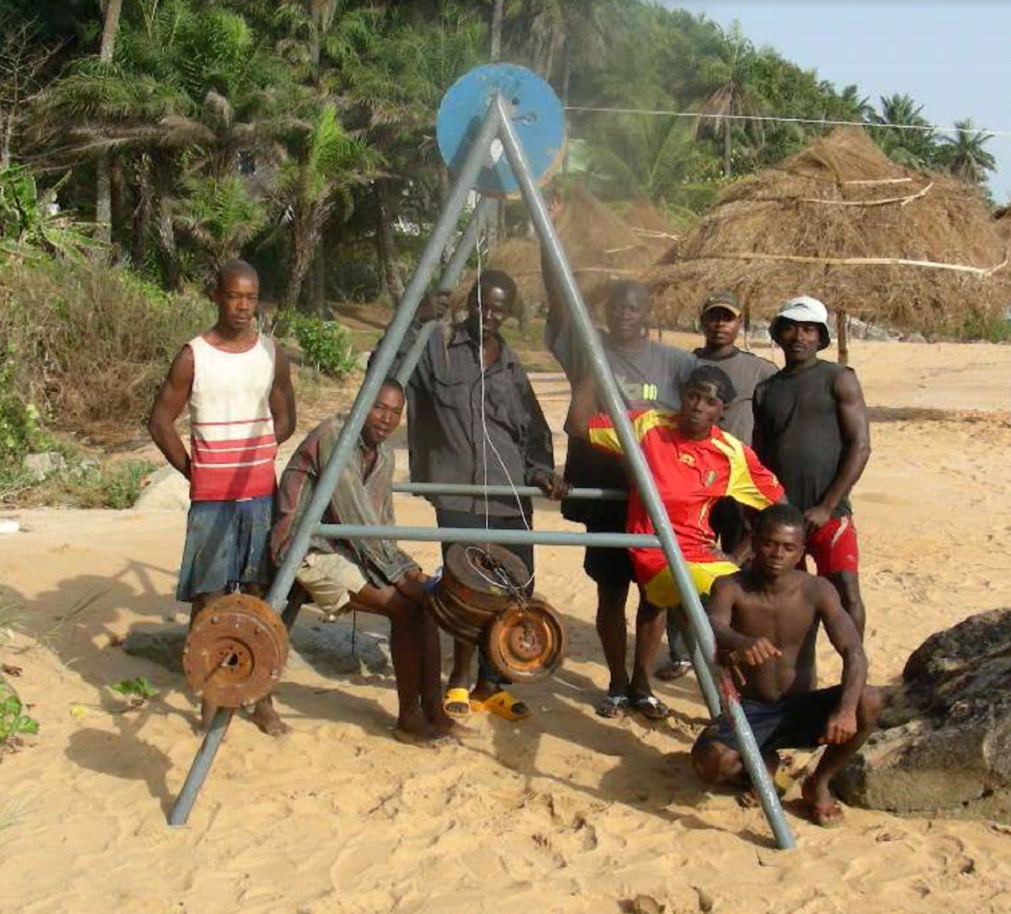 Second attempt for the water unit deployed in Guinea. The larger basked was filled with sandbags to provide a stable anchor at the bottom, over which the arm unit (one end is not visible in the picture) would rotate.