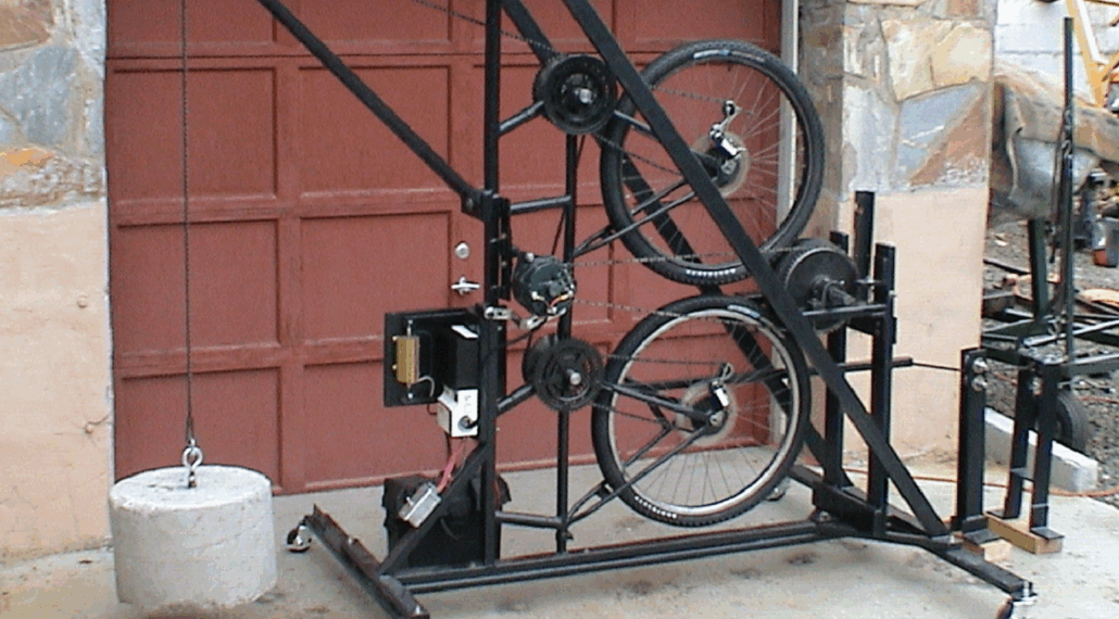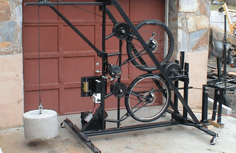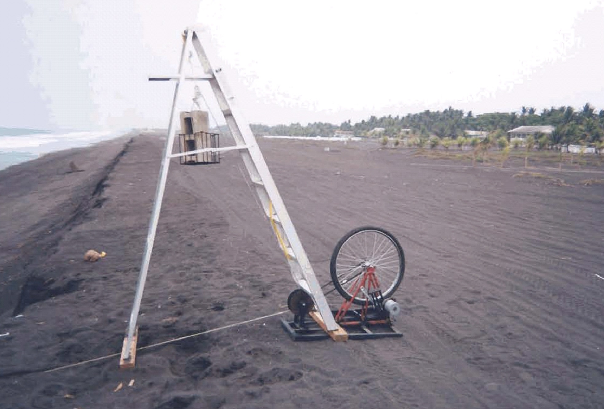 The cable extended about 200 yards into the surf, beyond the beakers, and ran first through a pulley attached to an engine block, and then up to a submerged, upside-down hammock with an inflated truck inner tube serving as a float. The small 24-volt DC motor spun by the bicycle tire would light up two small lights for about 3 seconds with each wave. Eventually the friction of the pulley wore through the cable.
